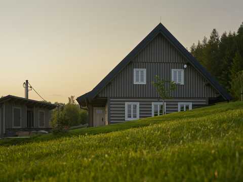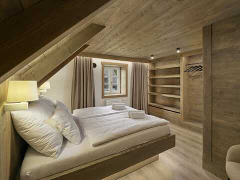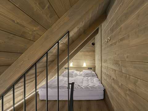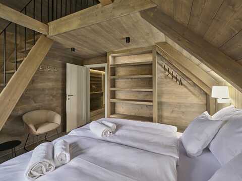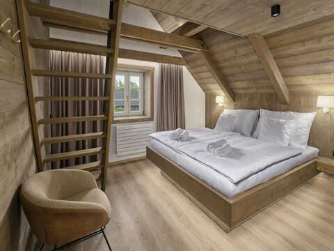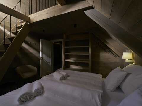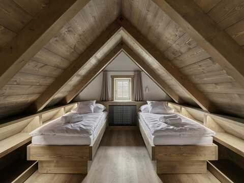 V podkroví najdete plnohodnotný pokoj s dvěma oddělenými postelemi.