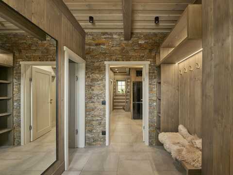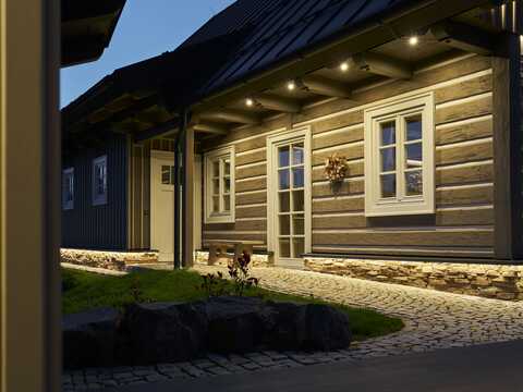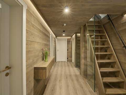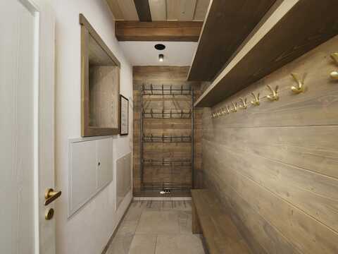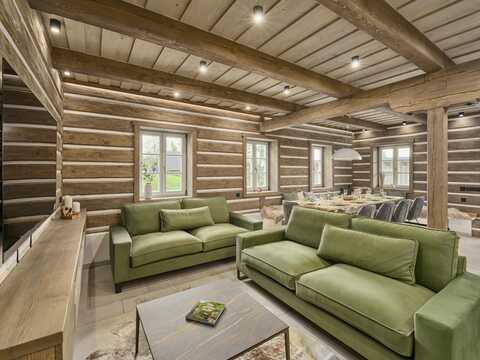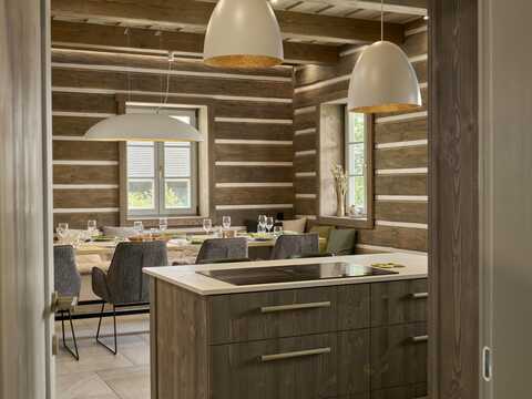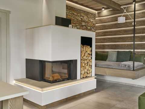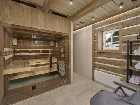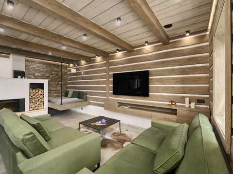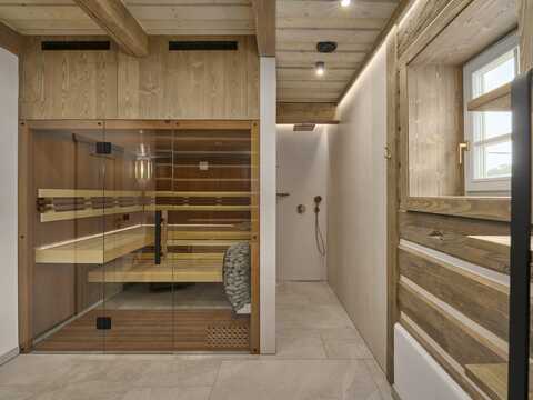 V přízemí se nachází prostorná obývací místnost s plně vybavenou kuchyní, velkým stolem a útulným prostorem k odpočinku u krbu. Dále zde najdete místnost pro sušení obuvi a oblečení, toaletu, saunu se sprchou a prostorem k relaxaci.