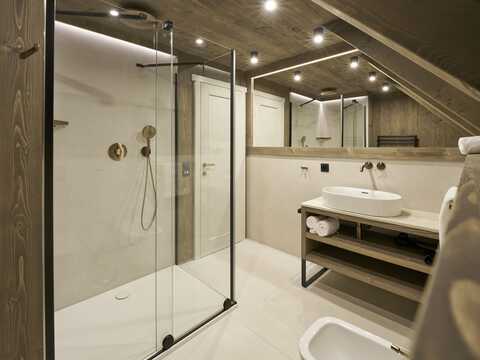 V patře se nachází 2 dvoulůžkové pokoje s manželskou postelí a možností přidání dětské postýlky (v horním domě s přístupem na terasu a zahradu), dále 2 čtyřlůžkové pokoje s manželskou postelí a dvoulůžkem na galerii. K dispozici jsou také 2 koupelny se sprchovým koutem, toaletou a bidetem, a jedna samostatná toaleta.